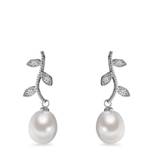 Pendant d'oreilles Argent Zircone 6 Pierres Rhodié perle d'eau douce, 8.5 mm