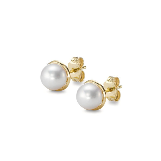 Clous d'oreilles Or jaune 18K perle d'eau douce blanc, 2 Perles, 6.5 mm Ø7.5 mm