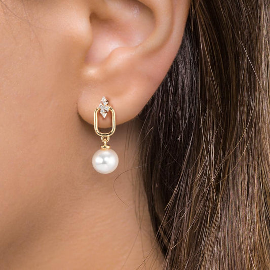 Pendant d'oreilles Or jaune 18K Diamant 0.05 ct, 12 Pierres, w-si perle d'eau douce, 2 Perles 7-7.5 mm