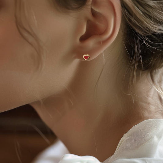 Clous d'oreilles Or jaune 14K [synth. Stein] rouge, 2 Pierres Coeur Ø4.5 mm