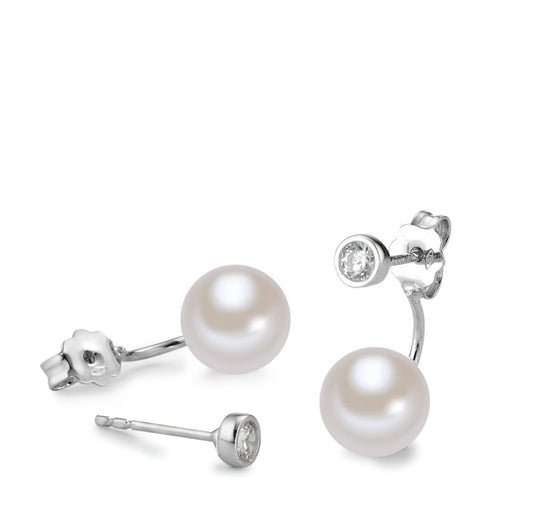 Clous d'oreilles Or blanc 18K Zircone perle d'eau douce blanc, 2 Perles, 8 mm
