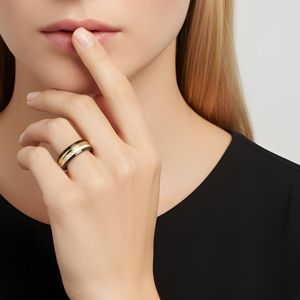 Bague pour femme en or jaune élégante, rehaussée d’un design innovant en carbone. Cette bague unique est ornée de diamants scintillants, alliant modernité et raffinement pour sublimer votre style au quotidien ou lors de vos occasions spéciales.